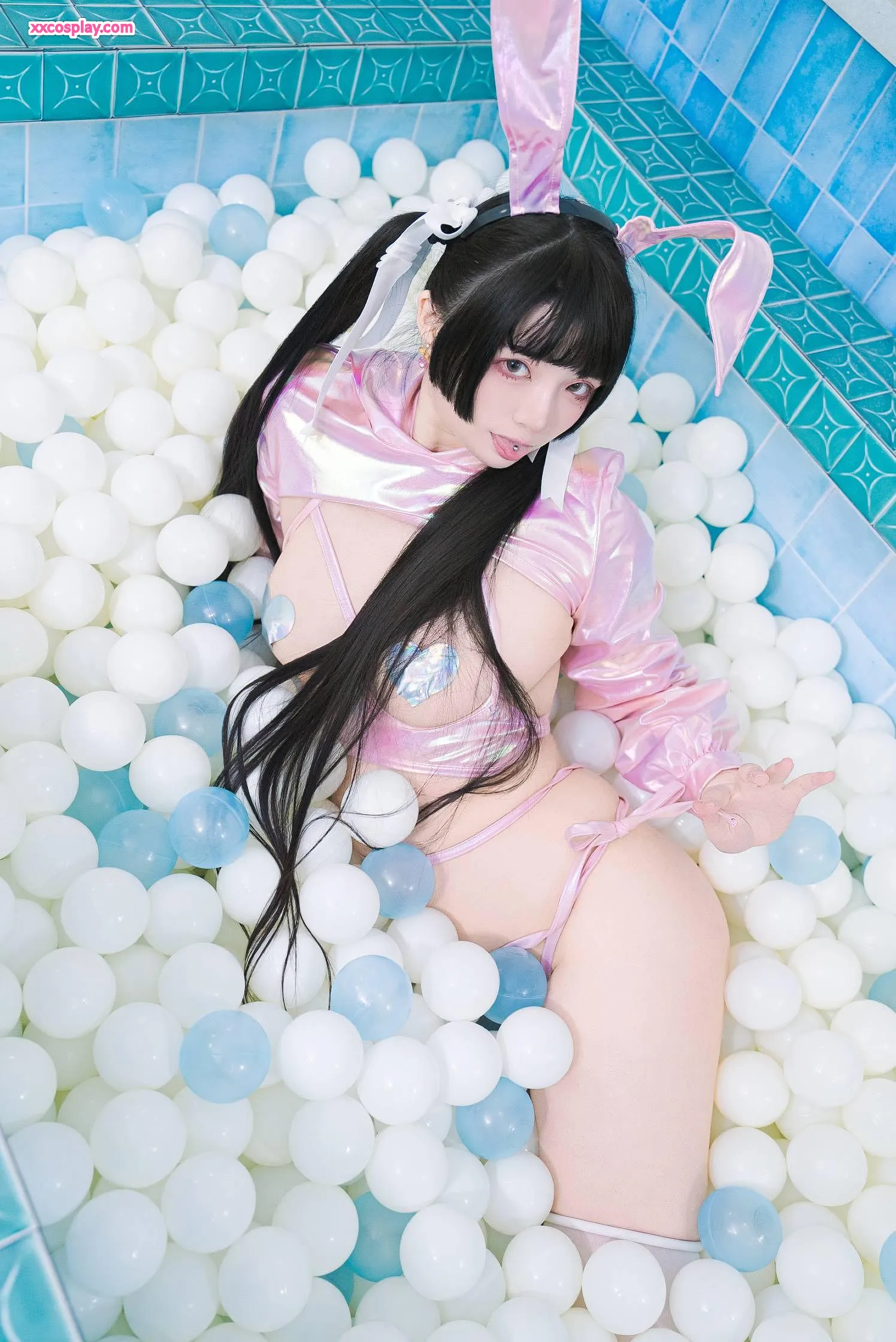 Raku: Pink Bunny Girl's Ecstasy in the Public Bathhouse 落落Raku Bunny Girl Onsen Masturbation Stockings