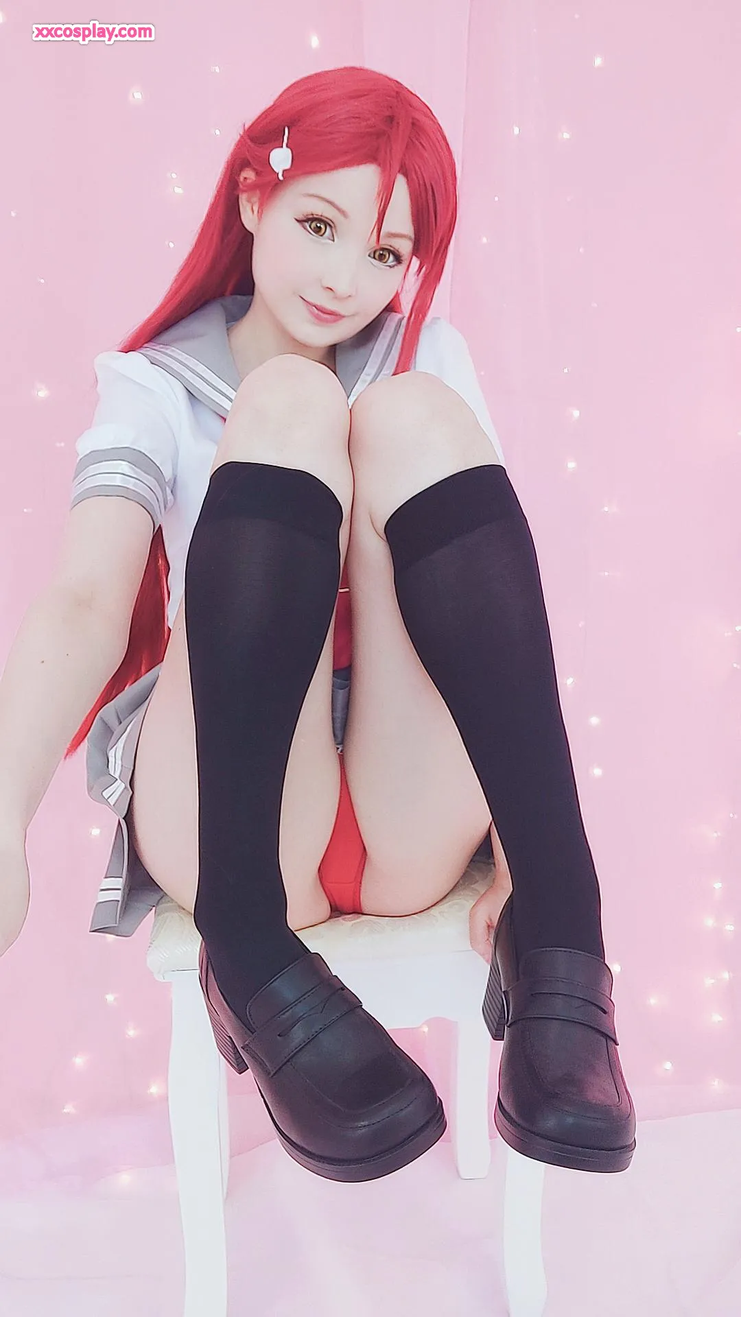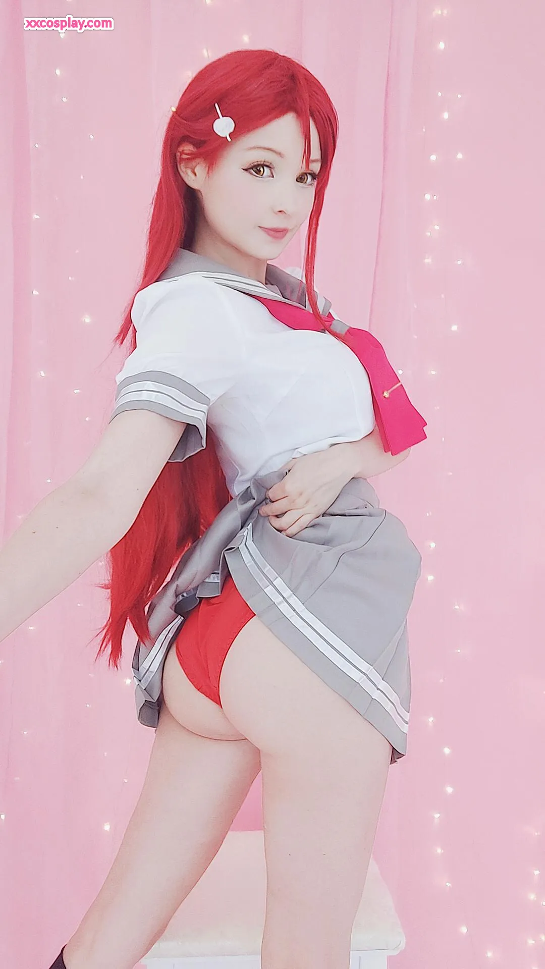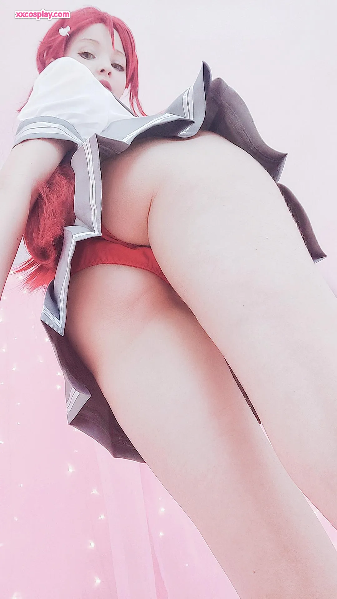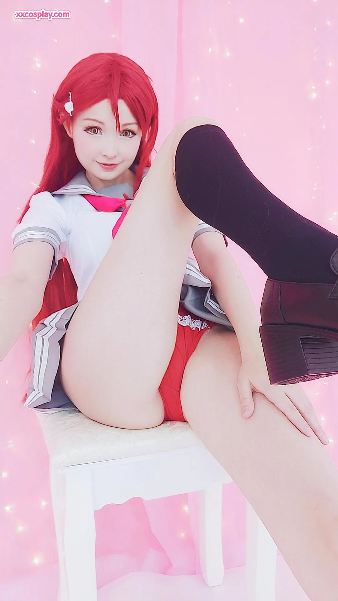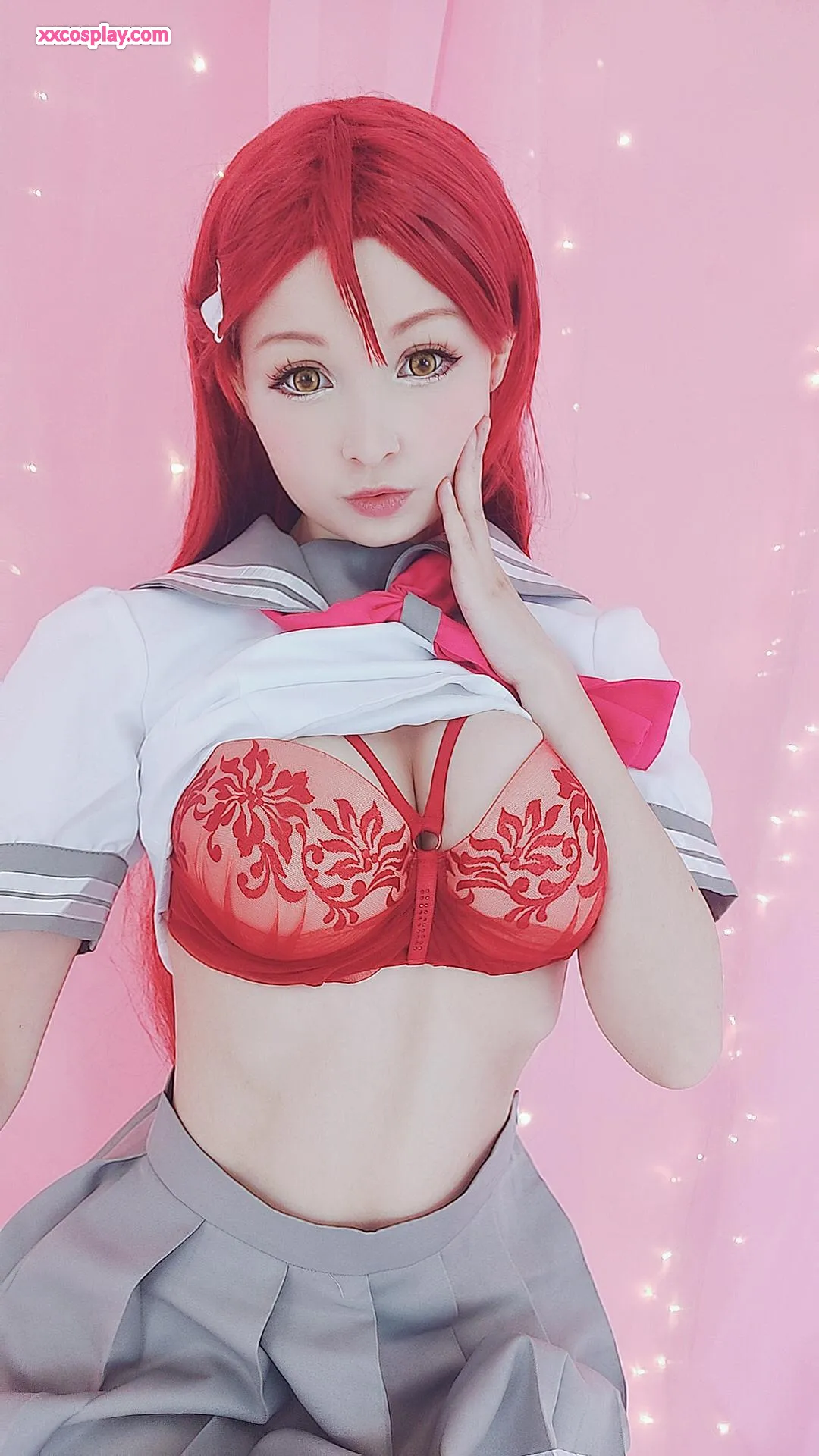 Hidori Rose sebagai Riko Sakurauchi dalam Lingerie Merah Renda Menggoda Hidori Lingerie Lace Stockings Cosplay