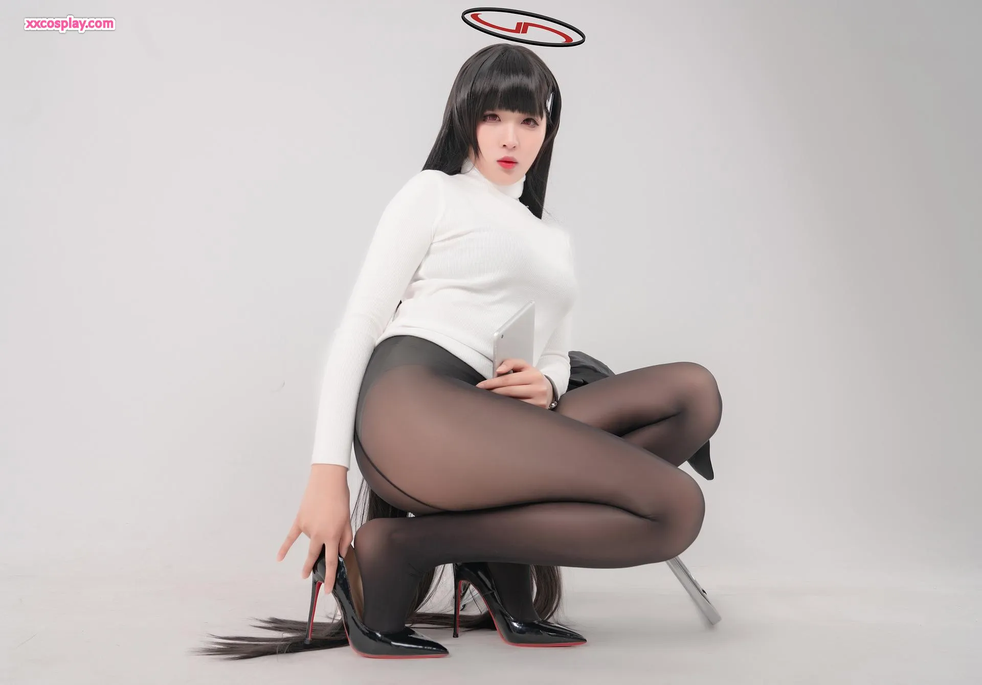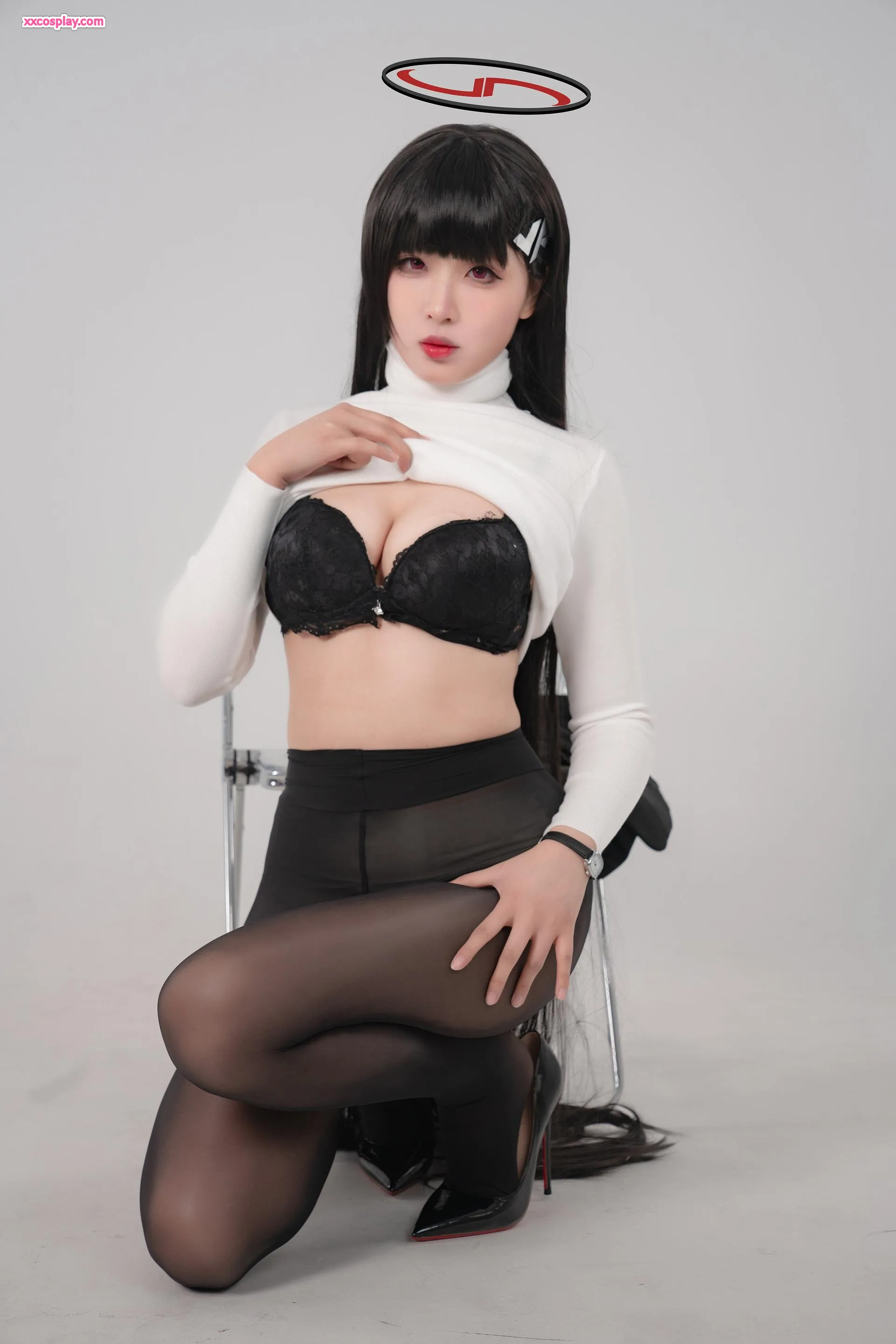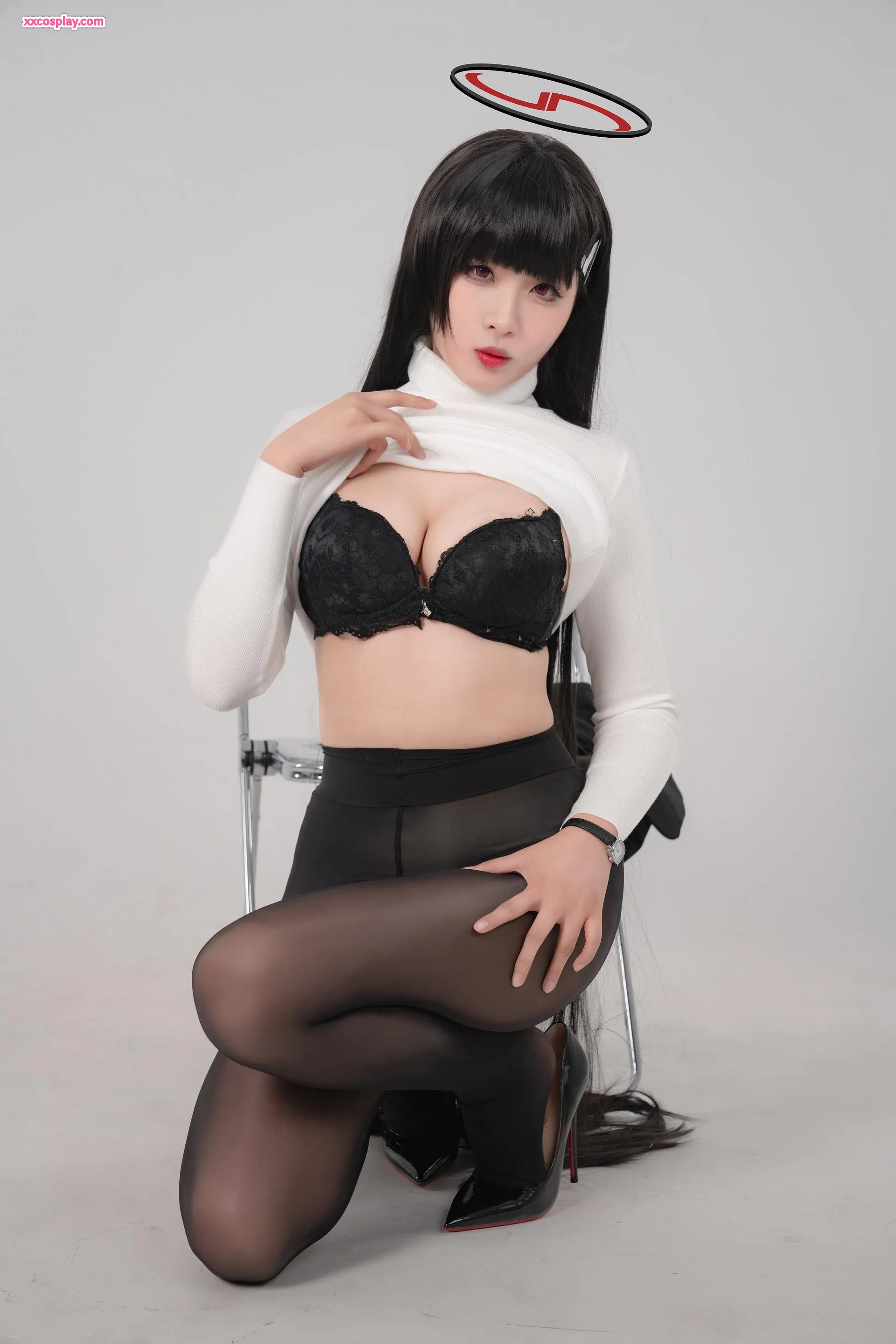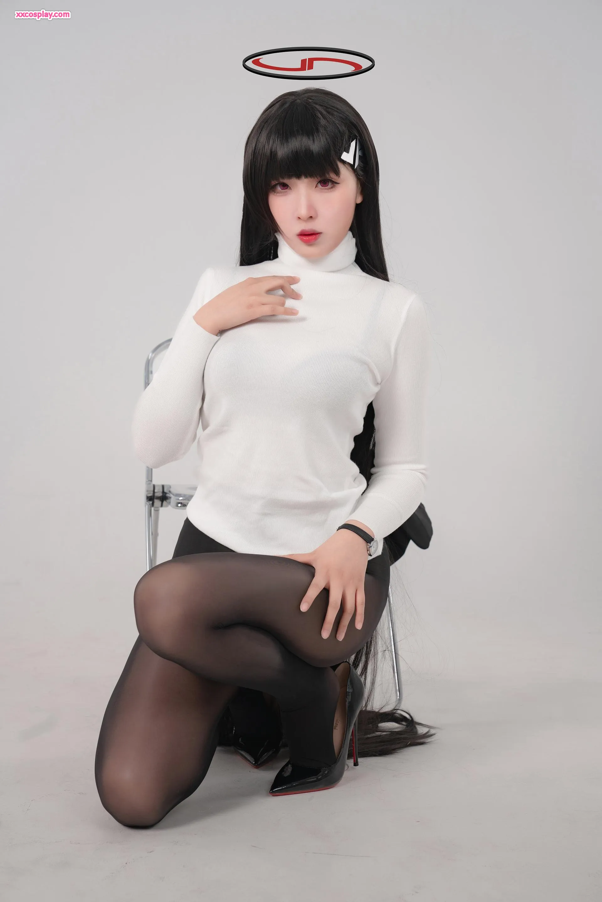 Xuan Xiao Xuejie: Áo Cao Cổ Trắng Quyến Rũ & Vớ Đen Trong Suốt 轩萧学姐 Sweater Stockings High Heels Gravure